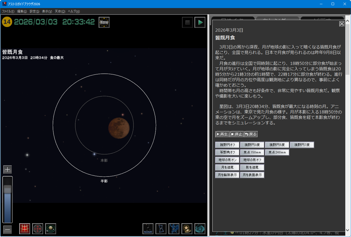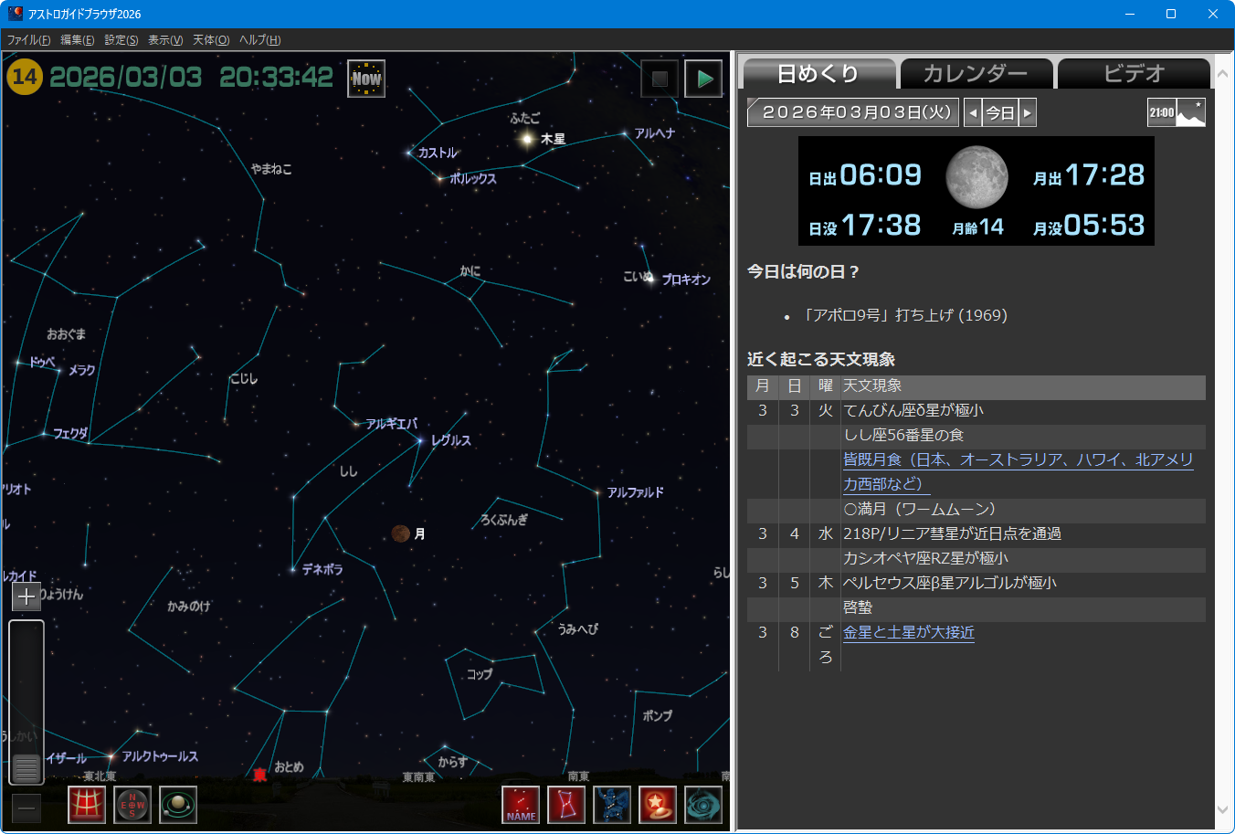 「アストロガイドブラウザ2026」は、2025年11月から2026年12月までの主な天文現象をパソコン上で再現できる、便利な天文シミュレーションソフトです。毎日・毎月の天文現象の解説をカレンダーの形式で閲覧できるほか、星図と連動して注目の現象をシミュレーションして楽しむことができます。