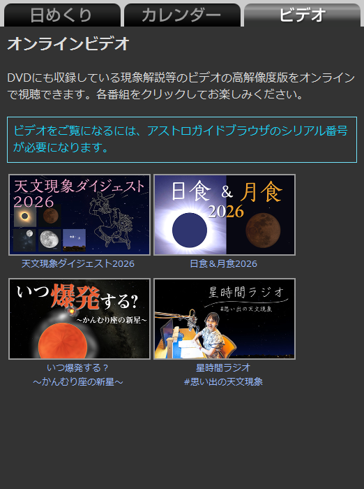 アストロガイドブラウザに関するお問い合わせや更新情報等につきましては、「アストロガイド 星空年鑑 2026」の製品サポートページをご覧ください。