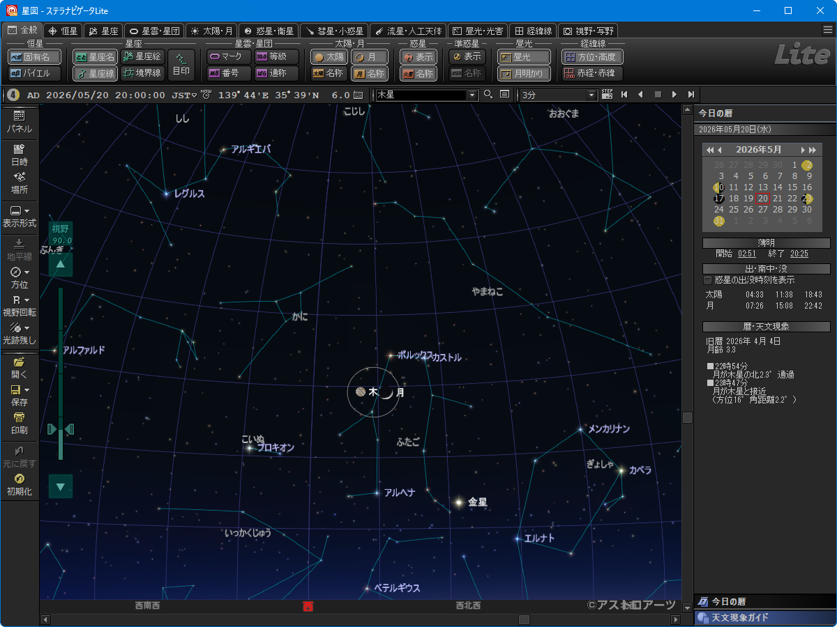 4月23日の夕方~宵、月と木星が並んで見える。画像クリックで表示拡大(ステラナビゲータLiteで星図作成)。