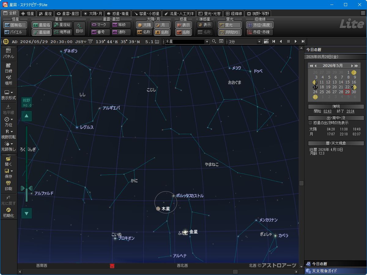 2026年4月中旬 21時の空(東京)。画像クリックで表示拡大(ステラナビゲータで星図作成)。