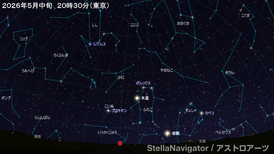 ふたご座の1等星ポルックスと並ぶ | 夕方~深夜/最接近5月29日ごろ |