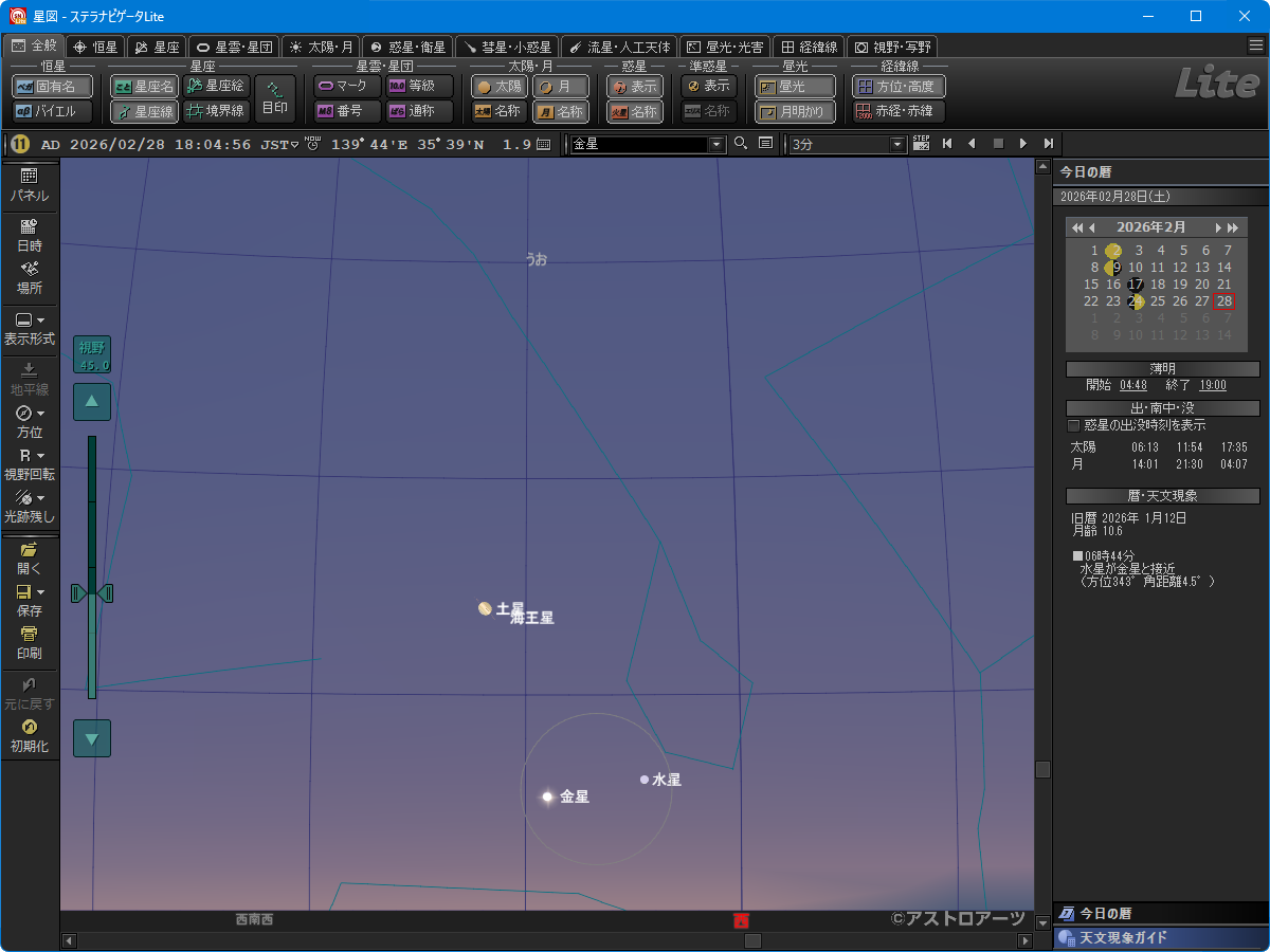 3月上旬の夕方、金星と土星が大接近して見える(» 解説)。最接近は8日ごろ。画像クリックで表示拡大(ステラナビゲータLiteで星図作成)。