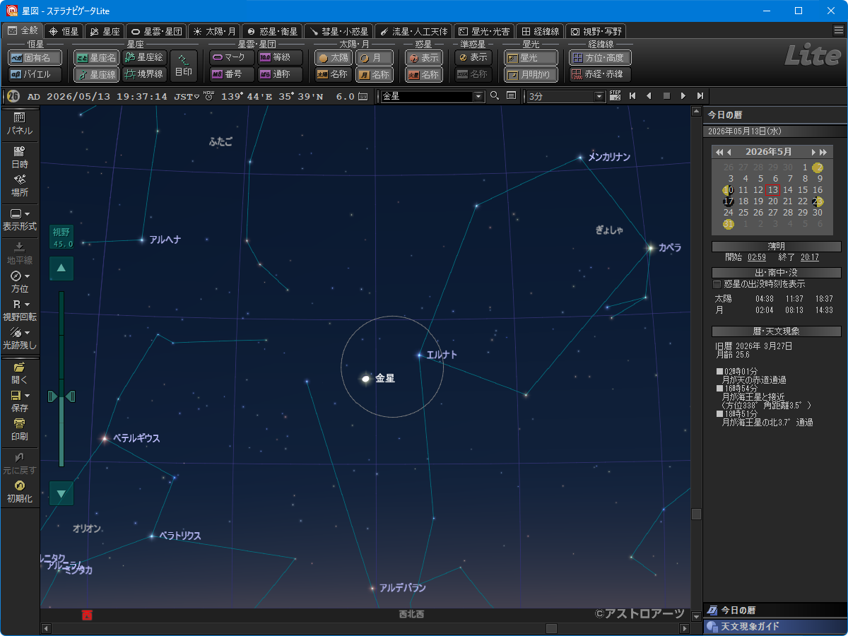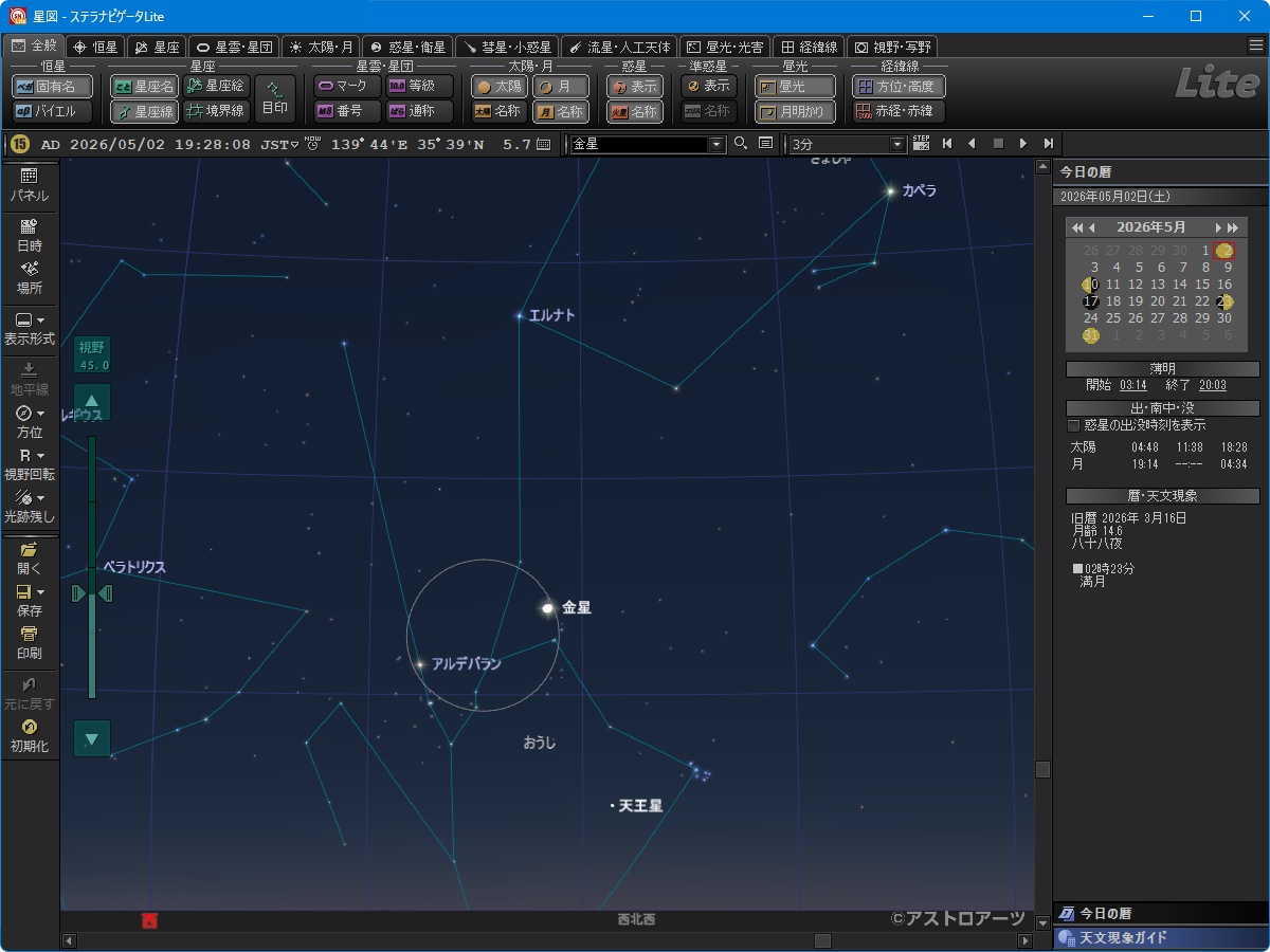 | 5月中旬 | おうし座の2等星エルナトと接近 | 夕方~宵 最接近13日ごろ |