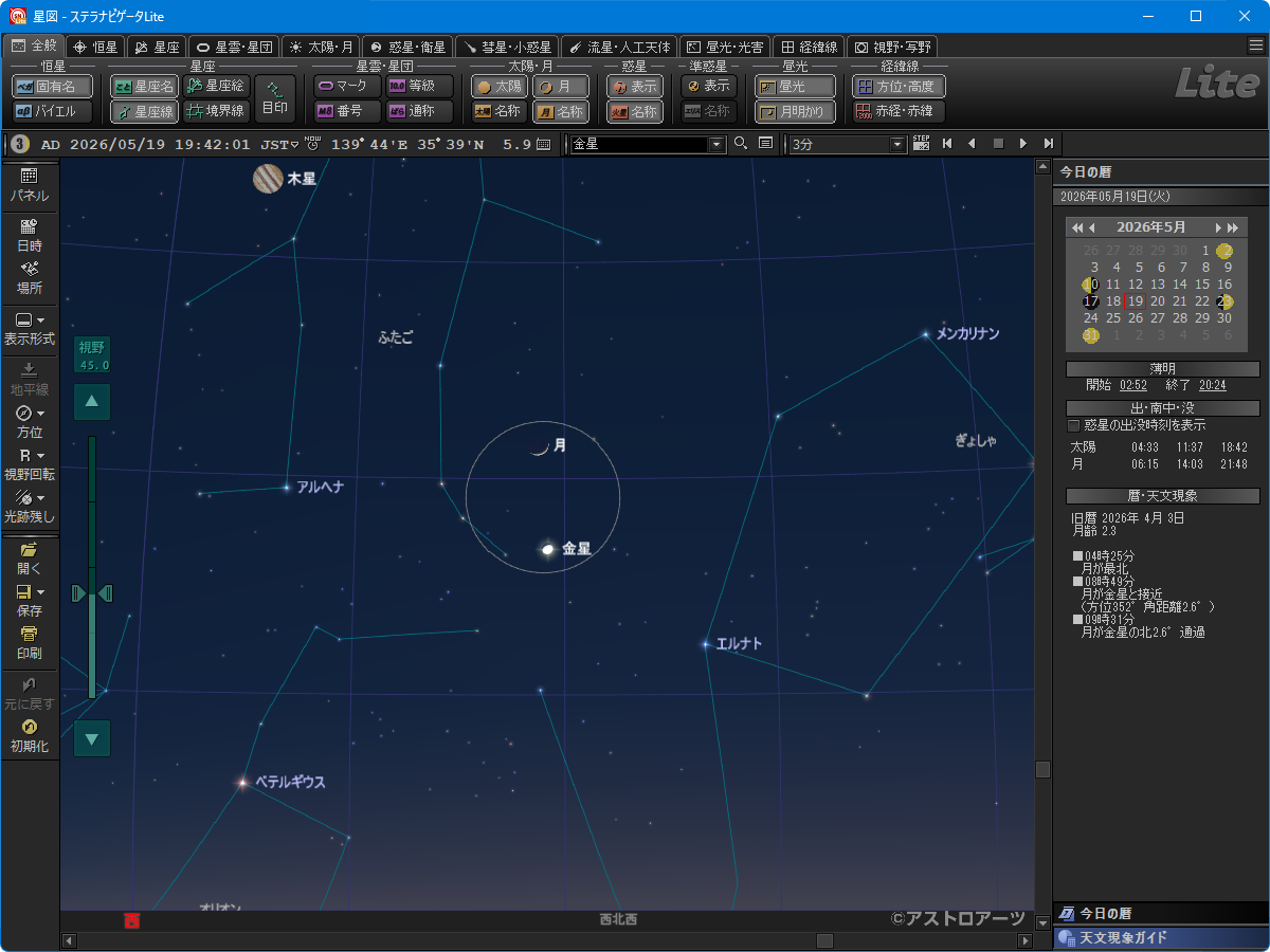 | 5月下旬 | ふたご座の3等星メブスタと大接近 | 夕方~宵 最接近27日ごろ |