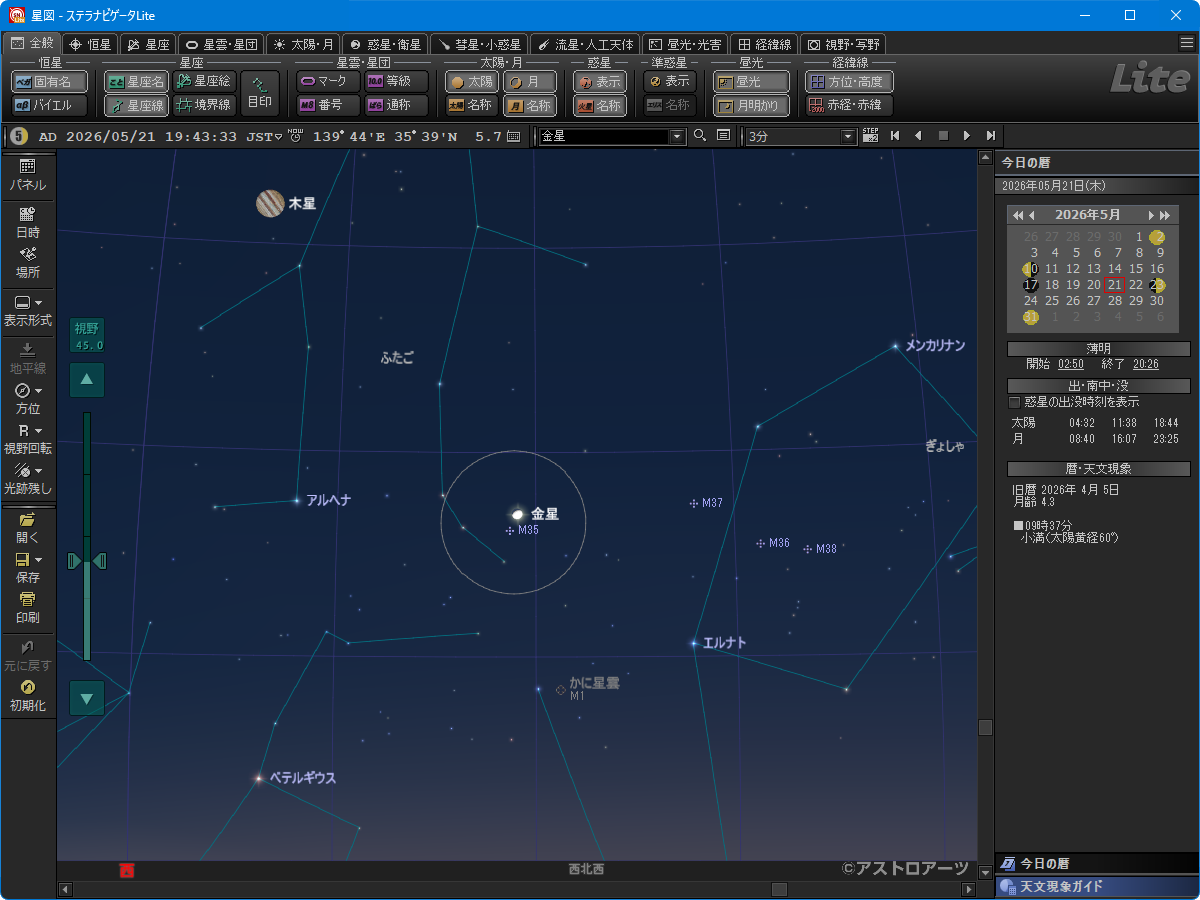 ふたご座の散開星団M35と大接近 | 夕方~宵 最接近21日ごろ |